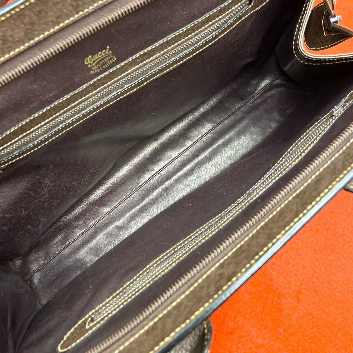 The spacious interior is lined in brown leather with dual zip compartments, stamped with “Gucci Boutique Made in Italy,” highlighting its authentic vintage craftsmanship. Perfect as a statement handbag or weekender, this bag blends the timeless heritage of two luxury fashion houses.